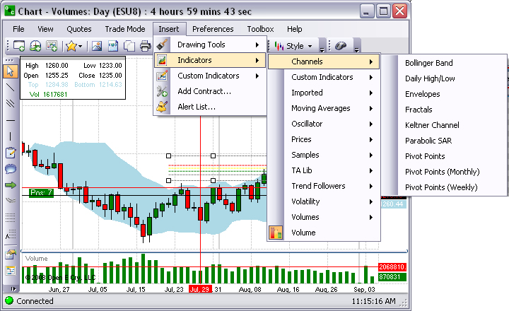 These are charts based upon volume make a new price bar (or candlestick, line, etc.) every time a specific number of contracts have been traded. This is the group of indicators on the drop-down menu group menu. Refer to the Figure below.