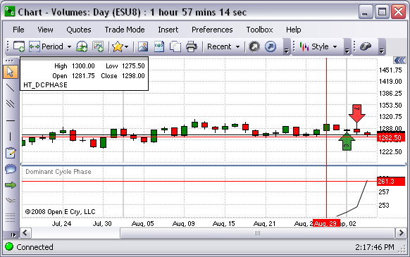 This oscillator finds trend reversal searching for a period when the close prices is close to the low price in an upward market of when the close prices is close to the high price in a downward market. Refer to the Figure below.