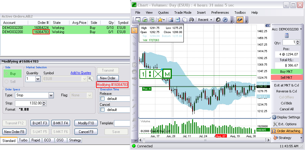 Note: The Cancel icon now displays in a darker border and the red text under the New Order button identifies the modifying order ticket number.