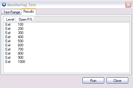 The Results tab will display showing you when this condition is met. In this case when Open P/L is >= 1000, a warning is issued. You can also notice the step increments of 200 until the maximum of 3,000 is reached.